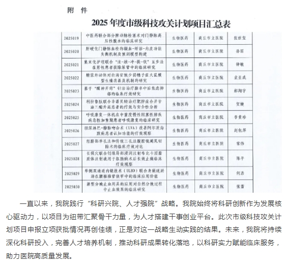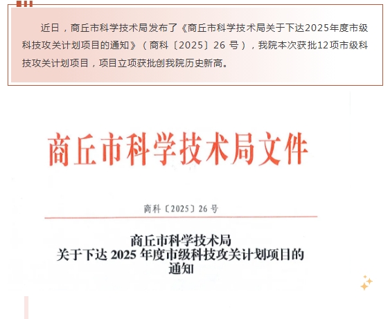 創(chuàng)新高!我院獲批12項商丘市2025年度市級科技攻關計劃項目