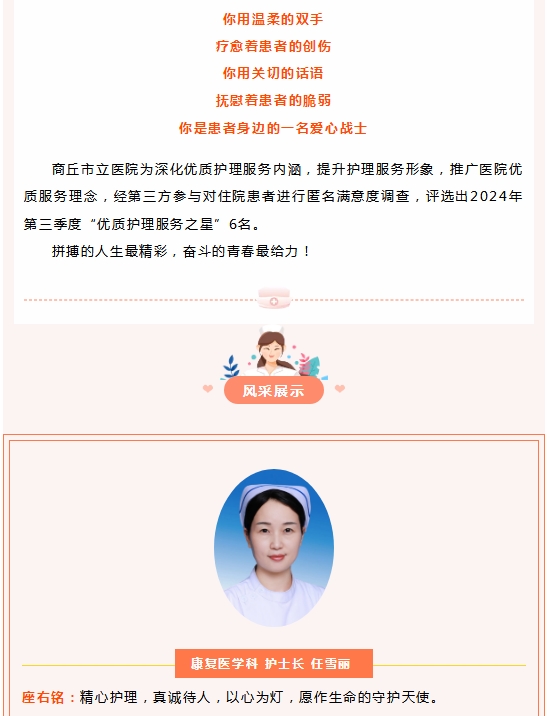 【優(yōu)質(zhì)護(hù)理服務(wù)之星】商丘市立醫(yī)院2024年第二季度優(yōu)質(zhì)護(hù)理服務(wù)之星風(fēng)采展示