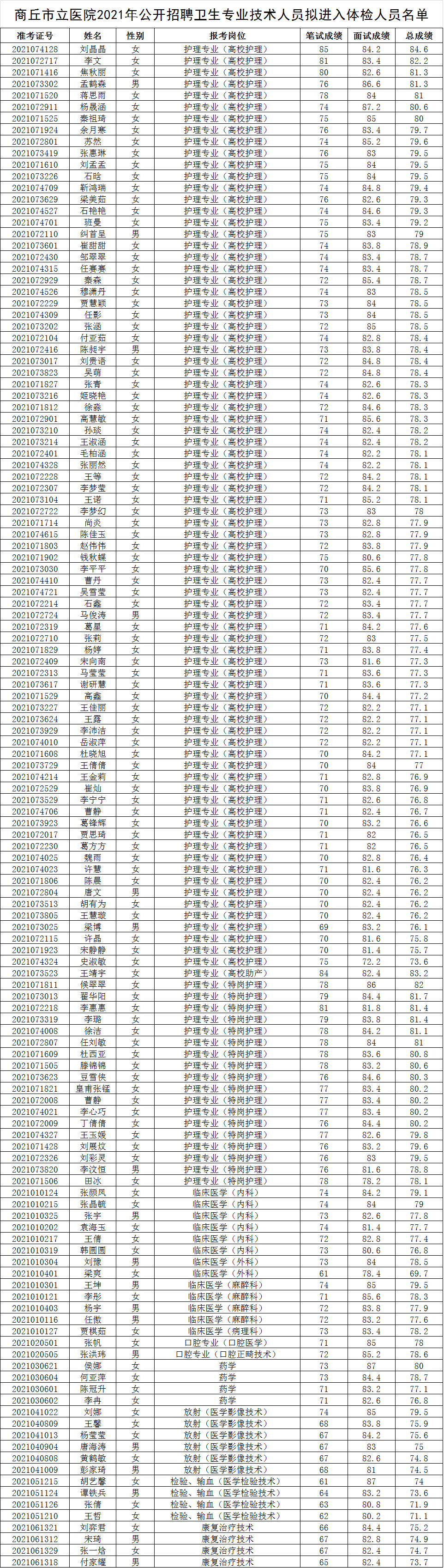 根據(jù)《商丘市立醫(yī)院2021年面向高校畢業(yè)生公開招聘衛(wèi)生專業(yè)技術(shù)人員公告》規(guī)定,根據(jù)擬聘用崗位,按照考試總成績從高分到低分的順序,等額確定參加體檢人員,現(xiàn)公布擬進入體檢人員名單(見附件)。